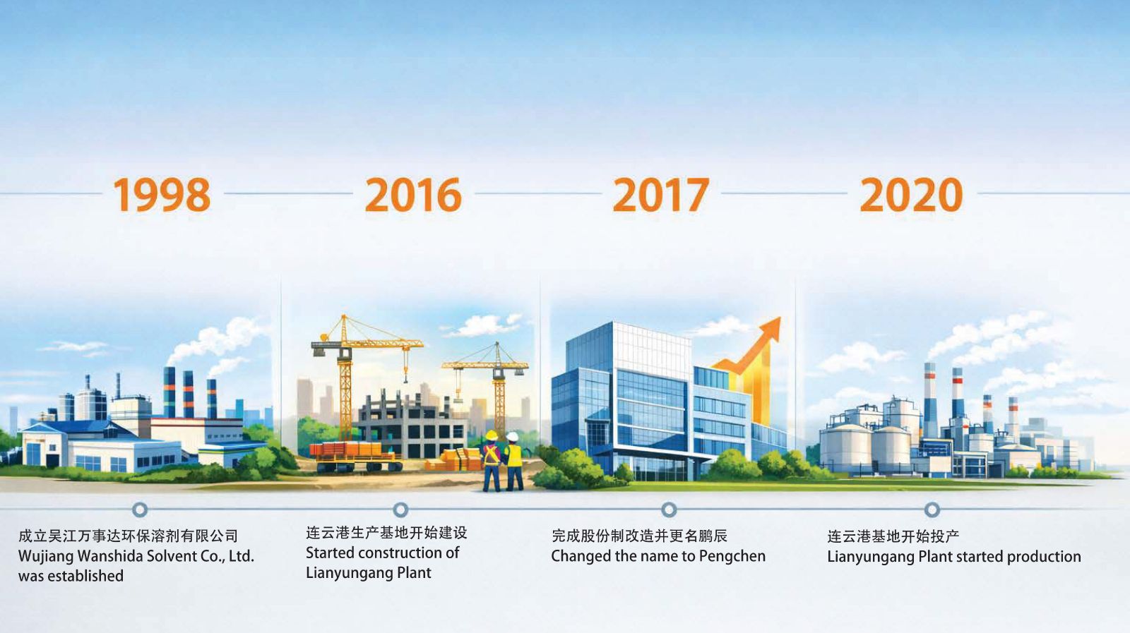 The company was founded in 1998 by Mr. Tan Mingchu under the name Wujiang Wanshida Solvent Co., Ltd. With continuous technological accumulation and market expansion, the business grew steadily. In 2016, a wholly owned subsidiary was launched in Xuwei New District, Lianyungang, Jiangsu Province, to develop a large-scale modern aromatic solvent production base. In 2017, Wujiang Wanshida completed its shareholding reform and was officially renamed Pengchen New Material Technology Co., Ltd., marking a major upgrade of its corporate structure and governance. After systematic construction and capacity deployment, the Lianyungang subsidiary commenced commercial production at the end of 2020, enabling the company to achieve a significant leap in production scale and to establish a leading position in China's high-boiling aromatic solvent industry.